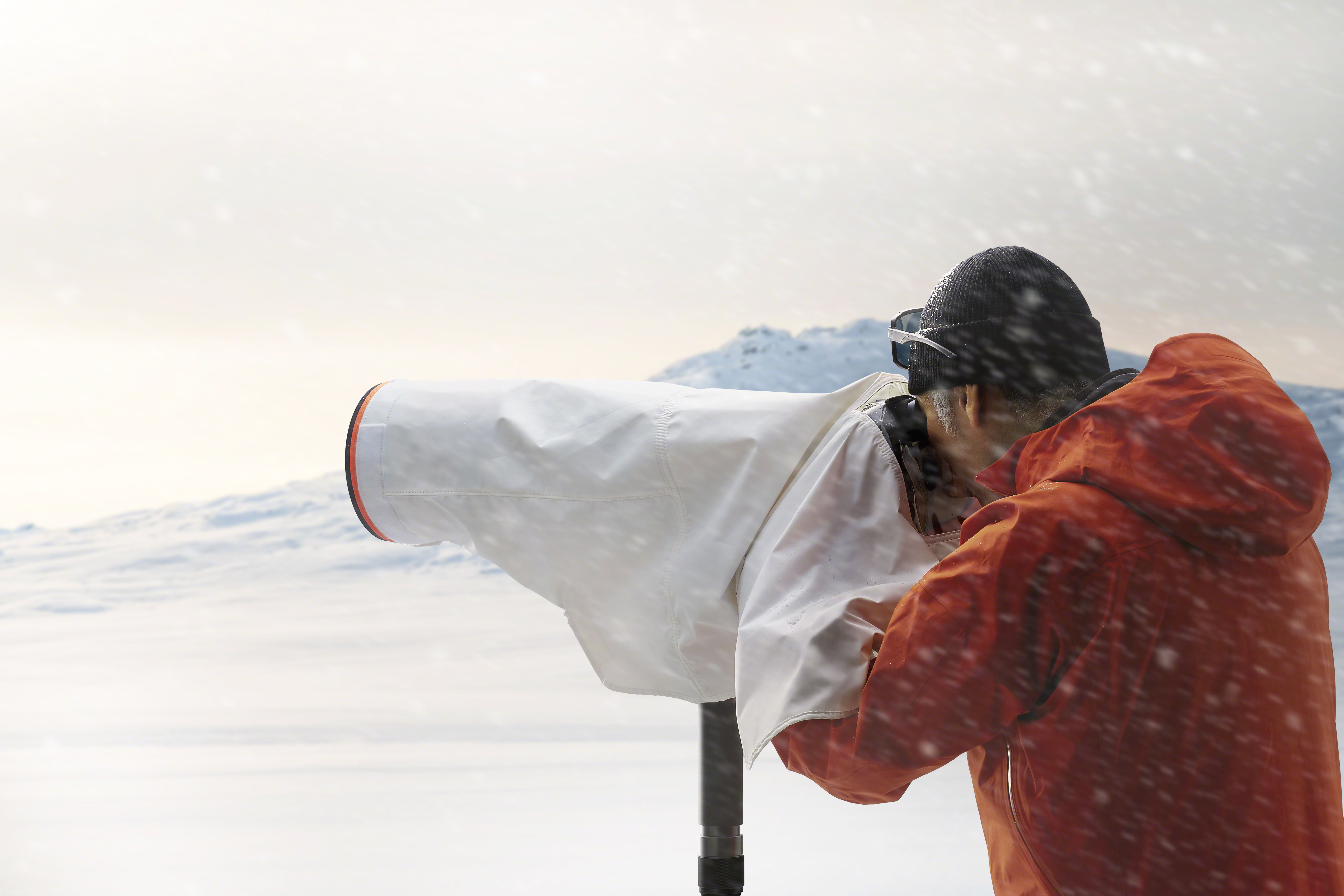 Det nye regntrekket er designet for å tåle røffe værforhold. Det beskytter kameraet og objektivet selv når du fotograferer i regn eller snø. Regntrekket er laget av pustende materialer (med vanndampgjennomtrengelighet på 20 000 g/m2/24t eller høyere1 ) som forhindrer tilførsel av fuktighet selv under lange fotograferingsøkter.